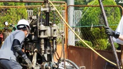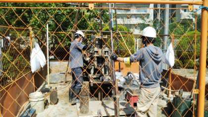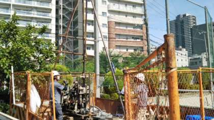 今秋から、6月初めにかけて、新校舎建築に備えて、地質調査(ボーリング調査)が始まりました。(3日ぐらいで30mも掘り進んだそうです。)