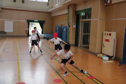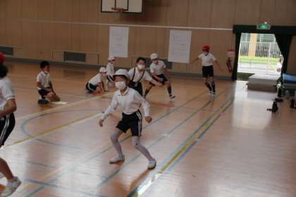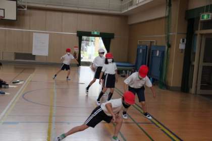 反復横跳びでは、ラインをまたがなくていい、少しタッチするだけでよいといルールに驚いていました。