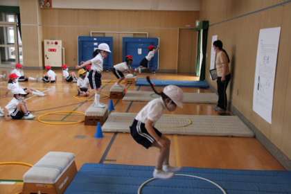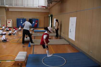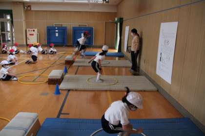 とび箱から、立ち幅跳びの要領で、うでをふってジャンプしてうまくちゃくちできるようにします。