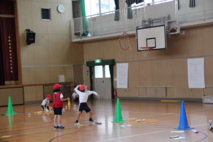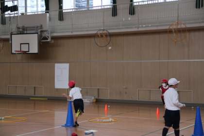 的当ては、1人2球ですが、4か所で2グループなので、たくさん投げて楽しむことができました。3年生ともなると助走をつけて、長い距離を投げる子もたくさんいます。