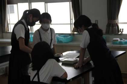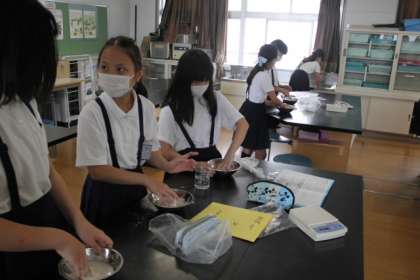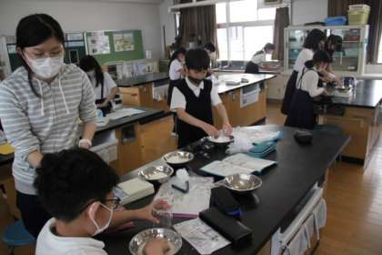 ダイラタンシーとは、片栗粉の粒(小さい粒子)に力が加えると、そのこまかい粒が密集して粒のすき間が小さくなり、固体になり、指で押してもかたくなります。
