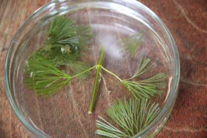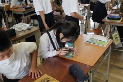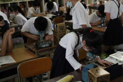 解剖顕微鏡を使って、水草に生みつけられたメダカの卵を拡大して見ています。
