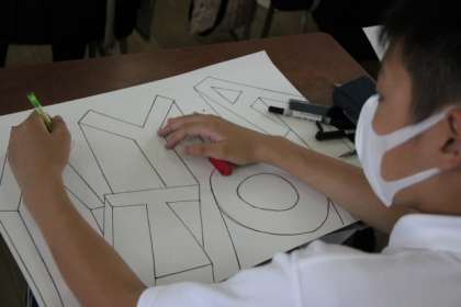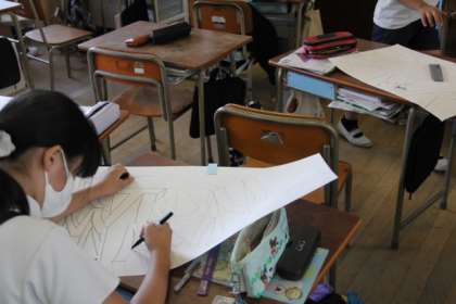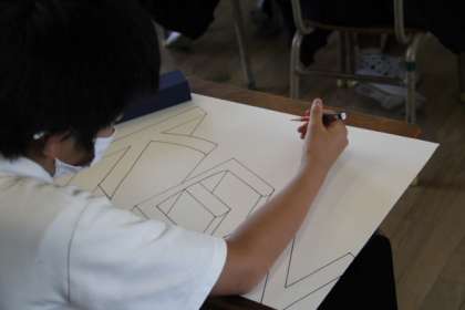 自分の名前のローマ字をビルの屋上にして、ビルを描き、周りの風景を描くそうです。