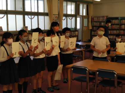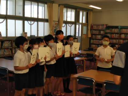 集会委員の児童がカードを1枚ずつ持って、「こ」「ご」「く」はどんなことばでしょう?というクイズになります。並べ替えると「こくご」になります。