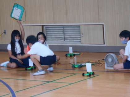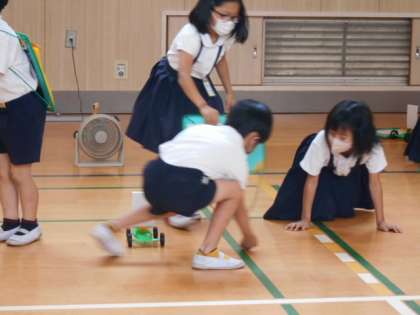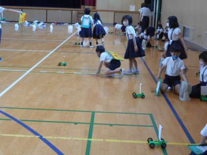「風とゴムの力のはたらき」の実験を体育館でしました。