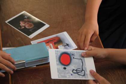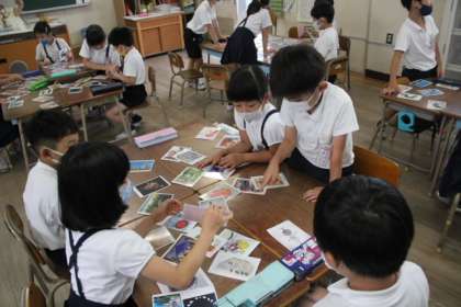 たとえば、「太陽があって、ブラックホールがある」というヒントを手が仮に作品を探して、グループで相談します。
