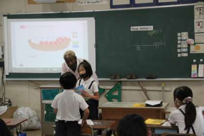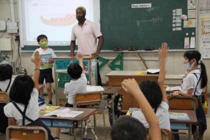 How many? とみんなで唱えて、りんごの数を英語で答えて当てます。