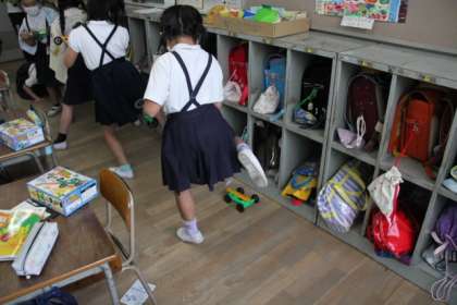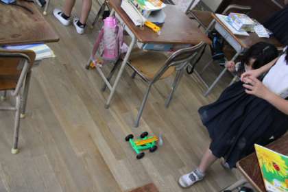 進む車を足の間に通して、進み方に満足している子たちもいました。