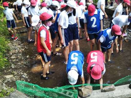 魚つかみとアスレチックを活動班を半分に分けて体験します。