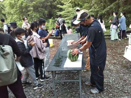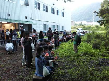 食後のデザートは、スイカでした。ハチ高原で食べる鳥取県産のスイカは特に甘くおいしいのです。今日も1日よく動きました。