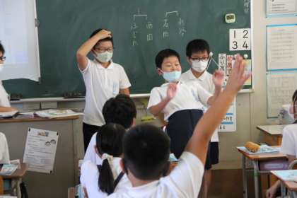 「書く」「話す」「食べる」「飲む」などの英語の表現とそれにあてはまるジェスチャーを学び覚えました。