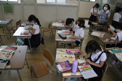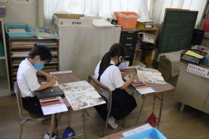 「うみ、プール、すいか、アイス、かきごおり」などの絵をかいて、なつのおもいでのおたよりを書きました。