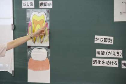 だ駅のはたらき(両手のひらの上に、食べ物があるとして、何回ぐらいかむか?噛む回数でだ液の量がちがう)ことや磨き残しの歯垢をミュータンス菌がエサにして酸を作り虫歯にすることなどを学習しました。