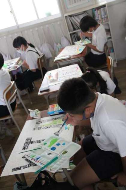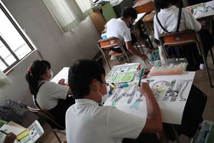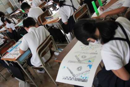 「線や色で名前を表そう」という仮題で、イニシアルを素材にデザインをして、彩色します。