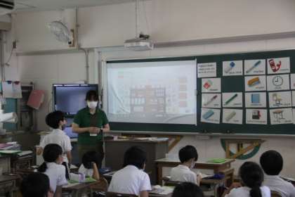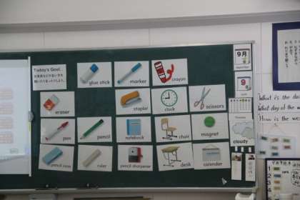 黒板に消しゴム、ノート、はさみなどの身近な文房具のカードが貼ってあります。