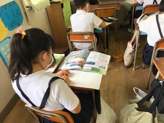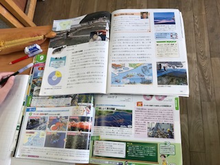 学習端末で調べる学習を進めながら、一方で共通に持っている資料や教科書を使ってみんなで調べ、まとめる学習も大切にしています。日本の漁業について、実際の書物の文字を読み資料を解釈していくことから、たくさんの気づきがありました。