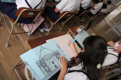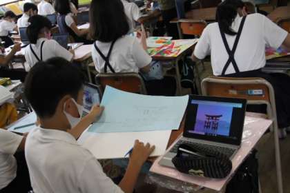 タブレットで、世界遺産の画像を調べて、原画を描きそれを題材にスチロールで版画にします。