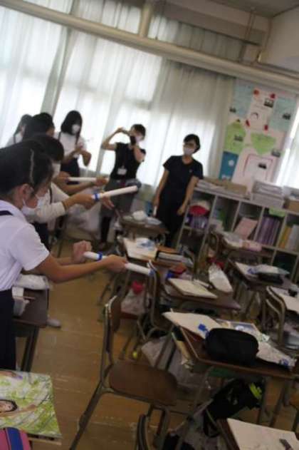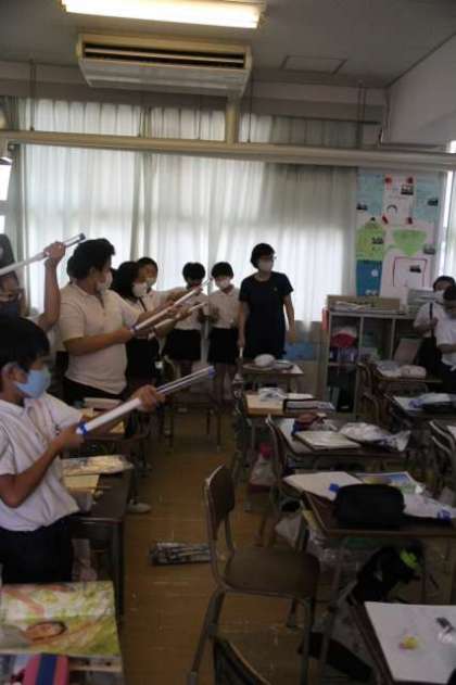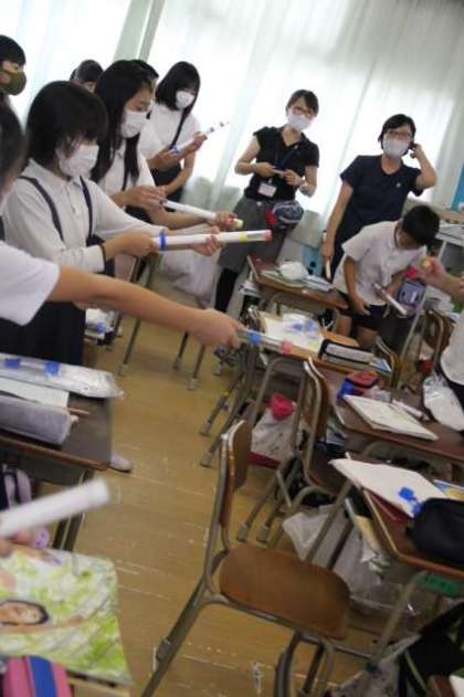 空気でっぽうは、パイプの中の空気を後ろの玉で押して、前の玉を押し出すことで飛ぶ仕組みになっています。