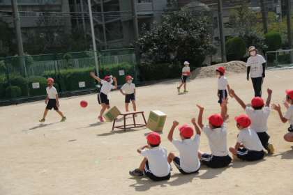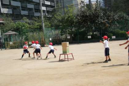 ポートボール台の上の、段ボールをねらって当てるのです。