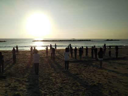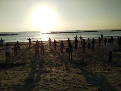 子どもたちの部屋にも黄金に輝く朝日が射しています。朝日に向かって、体操です。すごく眠れた、良く眠れた、と普通と眠れなかったは、だいたい同じ割合で良く眠れた子が多いです。発熱者もなく全員元気です。