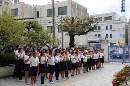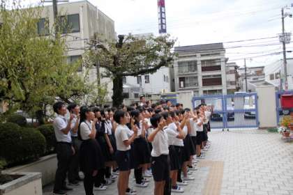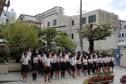 6年生が、正門の付近で集合して写真撮影をしていました。