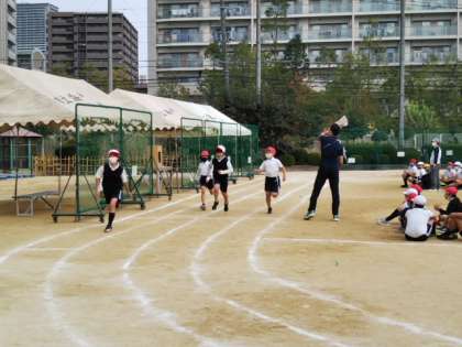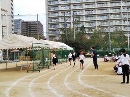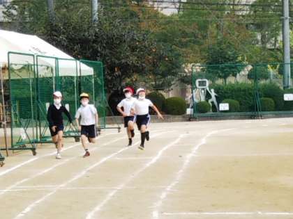 アウトコースの児童が、先行しますが、走力が同じなら最後の直線で並ぶことになります。