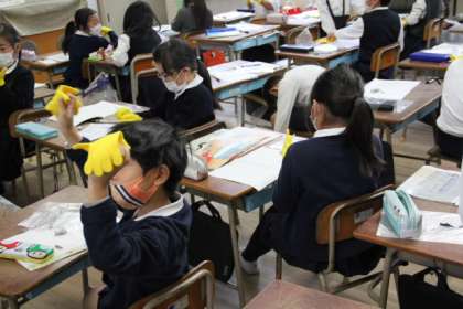 2−2で、運動会のダンスで使用するカラー手袋の試着をしていました。