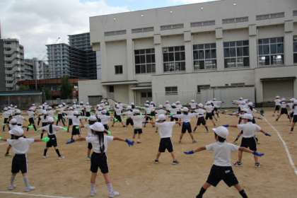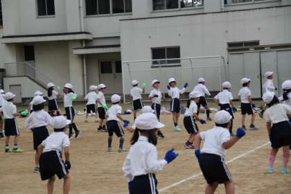 1、2年生が今日からカラー手袋をつけてダンスの練習をしました。