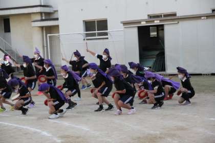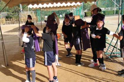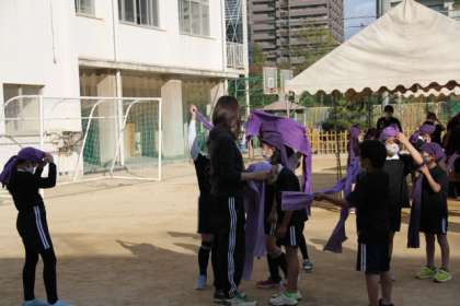 3,4年生が、頭にサージというターバンのような布を巻いて、エイサーを練習しました。サージはなかなか巻きにくいのです。