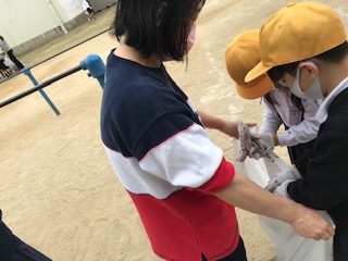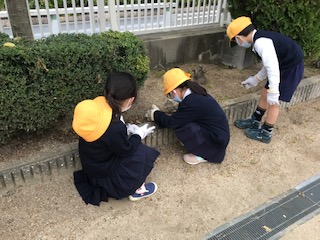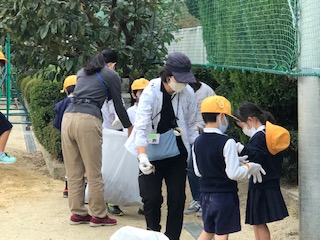 1年生は落ち葉がいっぱいだね、と秋の自然を感じながら枯葉をあつめていました。軍手に枯葉がついて、後から、ちょっと大変そうでした。これもがんばった証拠ですね。