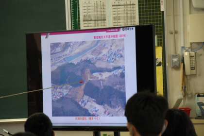 地震や津波について、山崩れや地割れ、断層などの様子を資料画像で学びました。
