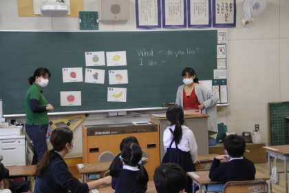 最後は、グループで「先生は、〇〇が好きですか?」と英語で質問して、先生が「Yes,No」で答えるゲームをしました。