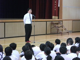 5月12日(火)2時間目に防犯訓練を行いました。福島警察署の方3名と、区役所のフッピー隊の方2名が来られました。警察の方が不審者役になり、玄関から侵入する想定で教職員が不審者を確保する訓練をしました。子どもたちは訓練終了の放送後、講堂に集まり、警察の方からお話を聞きました。普段から不審者への備えをすることの大切さを改めて感じました。
