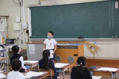 「わかりやすい声で」「スピードを考えて」「みんなを見て」などいろいろめあてを決めて発表していました。