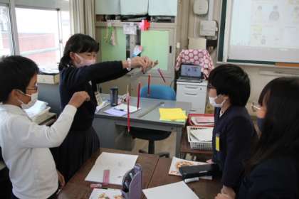 「いろいろな物の重さをくらべてみよう」というめあてで、アルミの棒にゴムをつけて、物の重さを比べました。