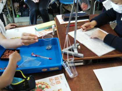 プラスチックのカップの片側に、はかるものを入れて、もう片側に積み木を入れていってその個数を記録しました。