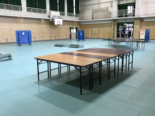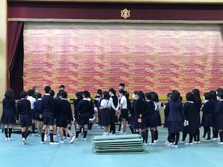 管理作業員さんや先生と一緒に力を合わせ、机や椅子を必要分出して、各学年展示位置に準備できました。講堂が美術館になる日が楽しみです。6年生のみなさん、ご苦労様でした。