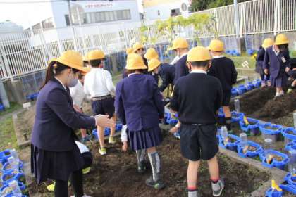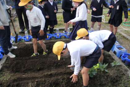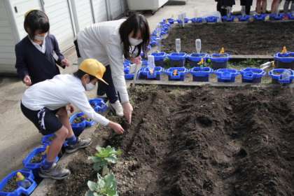 学習園の草引きをして、耕してから「だいこん」の種をまいていました。