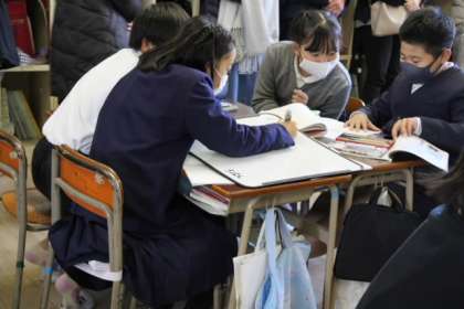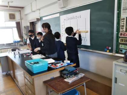 5年生は、1組が理科で、ふりこの周期の実験をしていました。2組は、社会科で日本の貿易について学習していました。