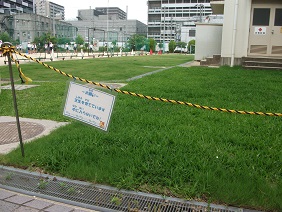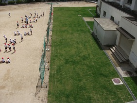 校庭の芝生化計画のもと、3月に子どもたちが中心となり植えた芝生が育ち、運動場の南側、体育館よりは今、青々とした芝が生えそろってきました。まだ養生期間中で、子どもたちは芝生の中に入ることはできませんが、6月ごろにはふかふかの芝生の上で、座ったり寝転んだりできることと思います。楽しみですね。