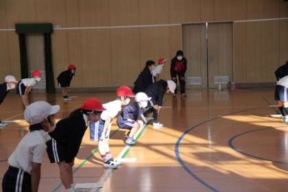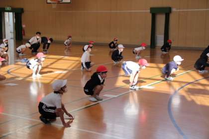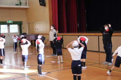 先生が赤と言ったら頭、黄色と言ったら肩、緑と言ったら ひざ、白と言ったら足首をタッチします。