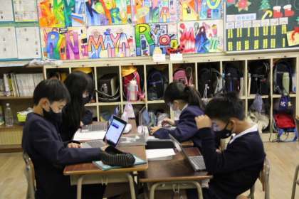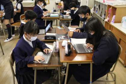 今日は、町づくりについて提案するために、お話やアンケート、インターネットで調べたことをグループごとに集めていました。