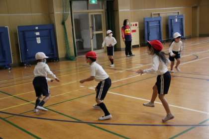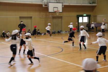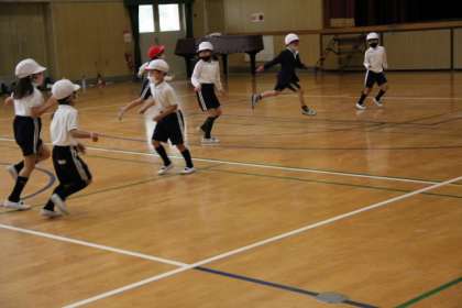 安全面を考えて、たて15mよこ20mぐらいの線の中で、おにごっこをしています。