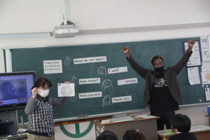 この時間は、ピザの材料を買うという設定で、お客さんとお店の役を交互にして英語表現に慣れました。