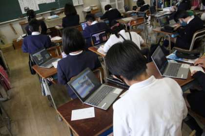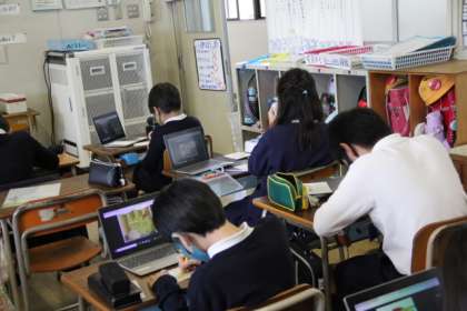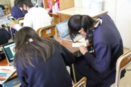 コンクールに出展するために6−1の子どもたちがPCで調べながら、年賀状を作成しています。