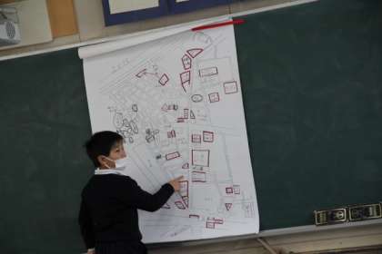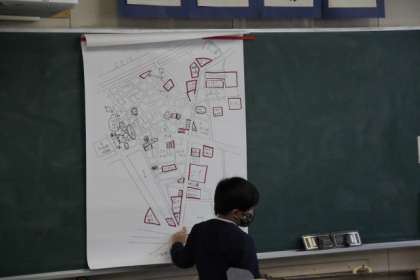 学校やマンションはもちろん、うどん屋さんやコンビニなどをてがかりに位置関係を確かめていきます。自分の家の周りから、だんだん世界が広がっていきます。