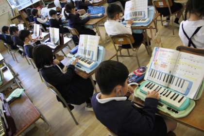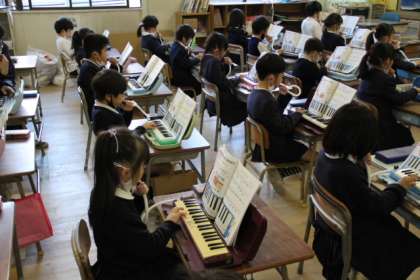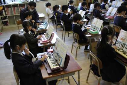 「どんぐり」といううたをけんばんハーモニカで練習していました。