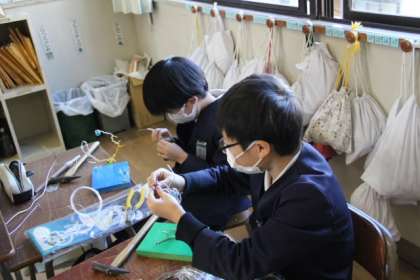 アルミの針金を木材の台に取り付けて、オブジェを作っています。