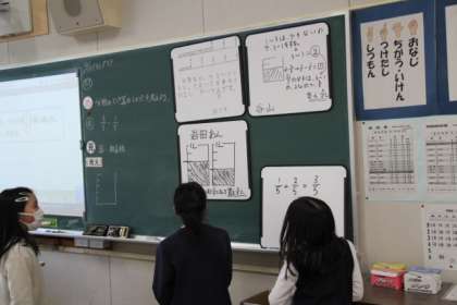 式は 3/5-1/5 なのですが、こたえの出し方をどう説明しますかというめあてで学習しました。