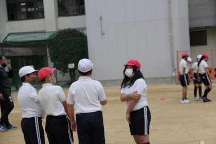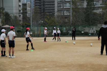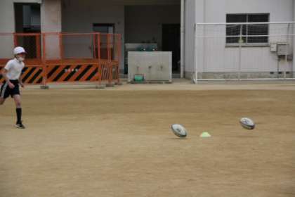 4チームに分かれて、キックして真ん中のラグビーボールに充てるゲームもありました。ラグビーボールは、どこへ転がるかわからないという面白さがあります。